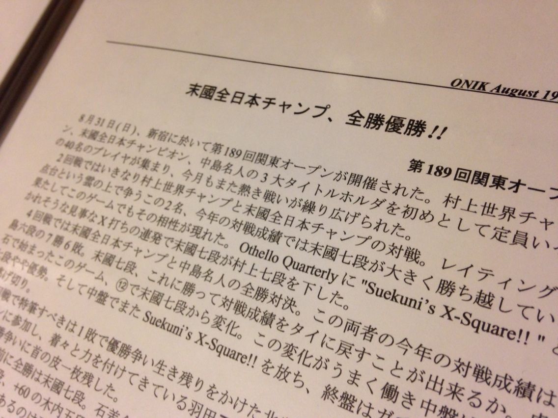そこには毎大会、新宿コスモで村上九段と末國九段が繰り広げる熱い棋譜が収録されてました(毎回2石差!)。入段まもない冨永八段や宮岡七段が当時の高段者をばっさばっさと打ち負かしてました。木内五段は当時から「アンチオセロ大王」を名乗ってました。中島八段は3大会に一回は寝坊をしてました。